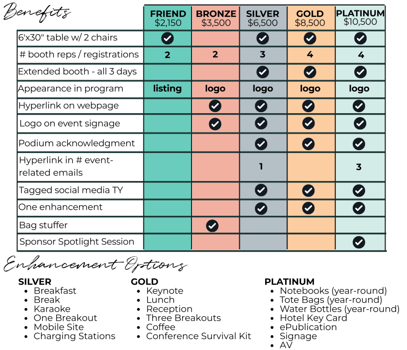 Opportunities: Choose the sponsorship level that best fits your visibility and engagement goals. Friend, Silver, Gold, and Platinum sponsorships include 6’x30″ exhibit table w/ 2 chairs.
